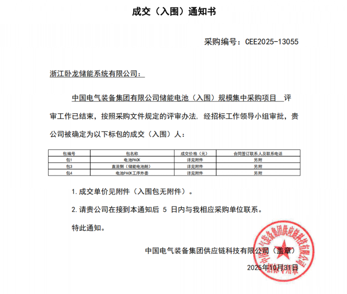 Recently, Zhejiang Wolong Energy Storage System Co., Ltd. officially received the "Notice of Transaction (Shortlisted)" issued by China Electrical Equipment Group Supply Chain Technology Co., Ltd., successfully shortlisted for the "China Electrical Equipment Group Co., Ltd. Energy Storage Battery (Shortlisted) Bulk Procurement Project" (Procurement No.: CEE2025-13055).